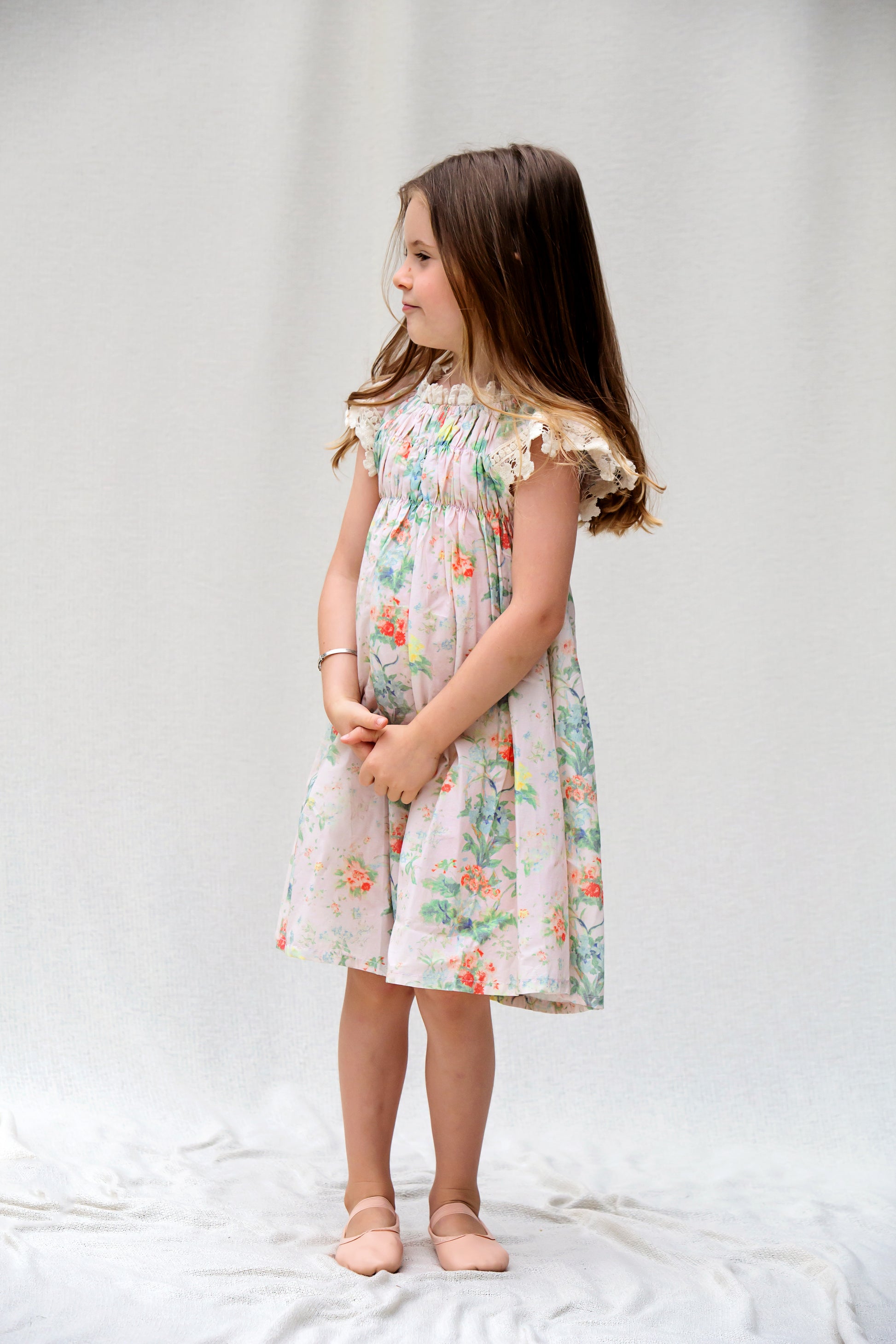 | Knee length, cotton birthday dress, with lace neckline and sleeve. Floral print in ballet pink. |